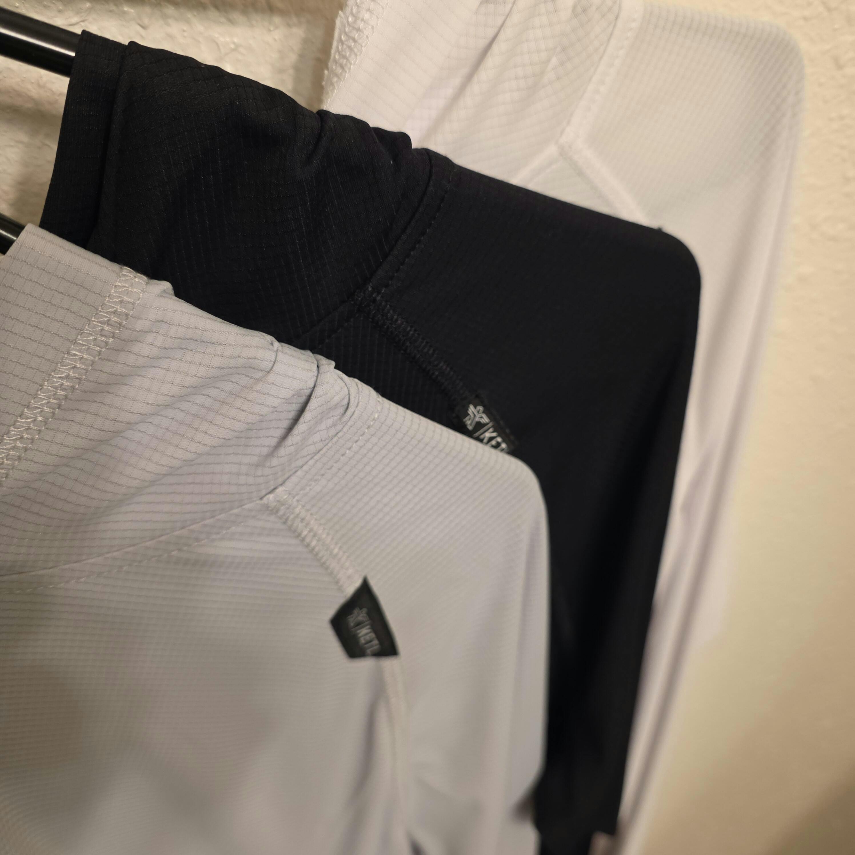 The magic is in the near weightless fabric. Our NoFry Sun Hoodie weighs in at only 118g in a size medium. 81g for the short sleeve and 105g for the long sleeve. The fabric itself comes in at just 79gsm.